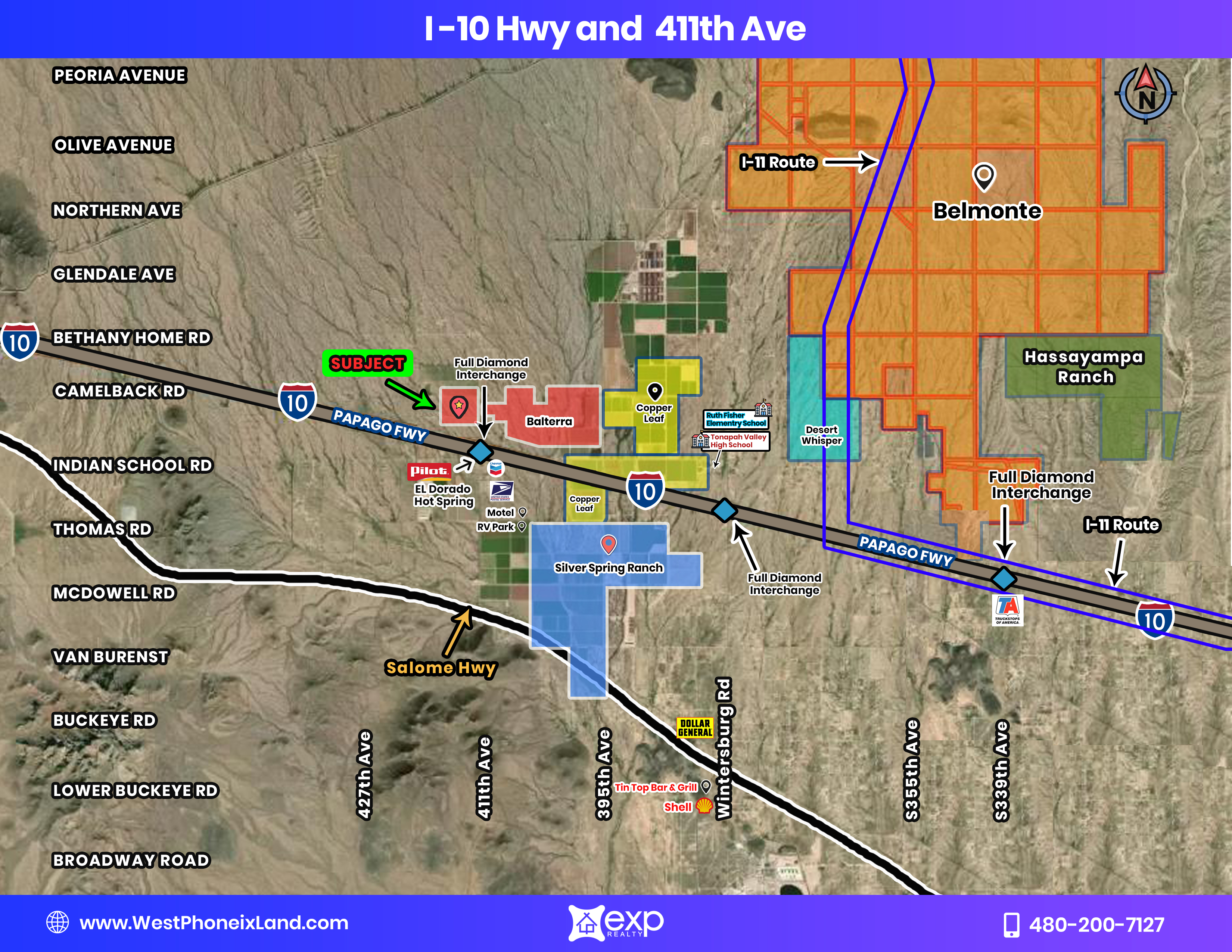 Off I-10 on Paved 411th Ave Half Mile Frontage on Paved 411th Ave and Half mile frontage on Camelback Road Part of Balterra Master plan and designated as Commercial Property Close to Belmonte/Bill Gates Smart City proposed land Close to Desert Whisp